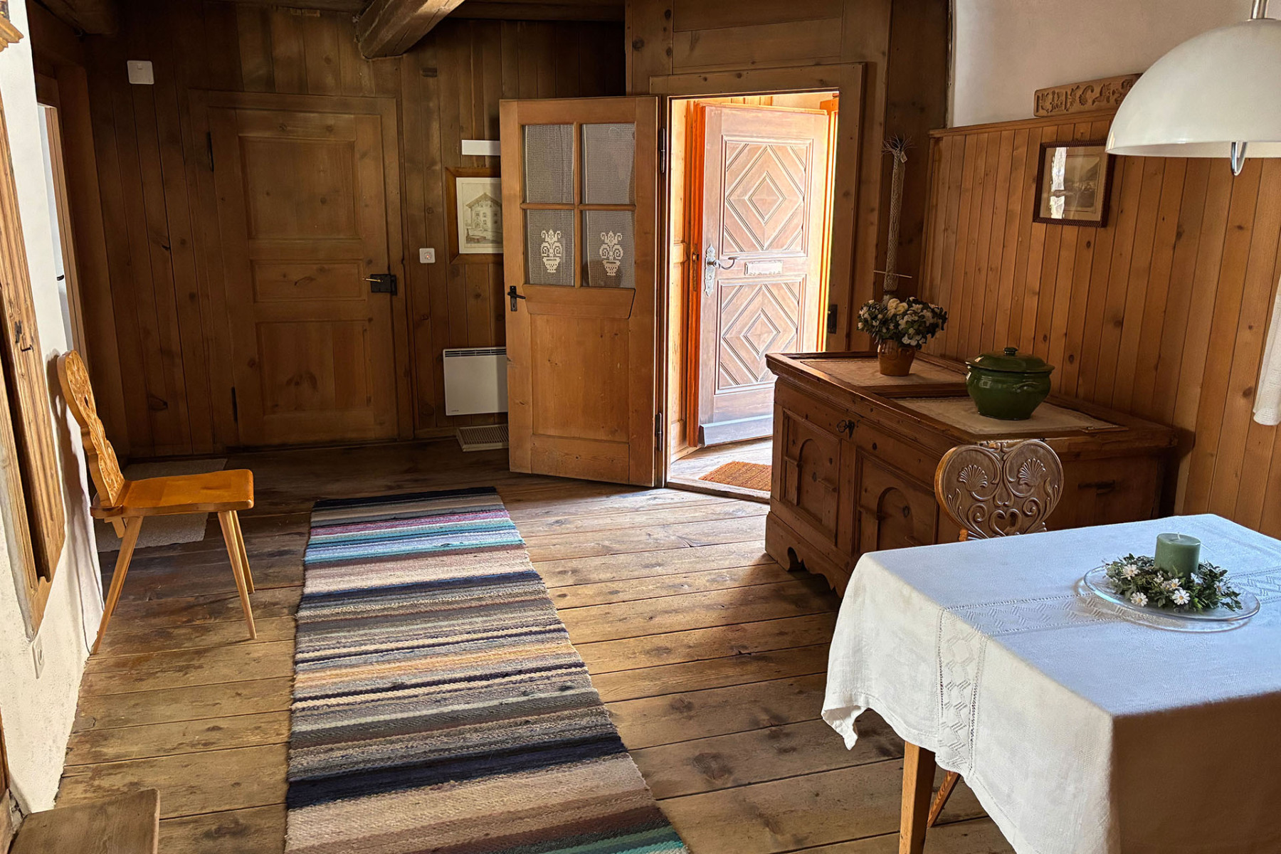 Durch den Keller gelangt man in den alten Stall und den Garten, über die Scheune geht's auf die grosse Terrasse, von der man einen wunderschönen Blick auf die Berge hat und dem Fluss Inn lauschen kann.