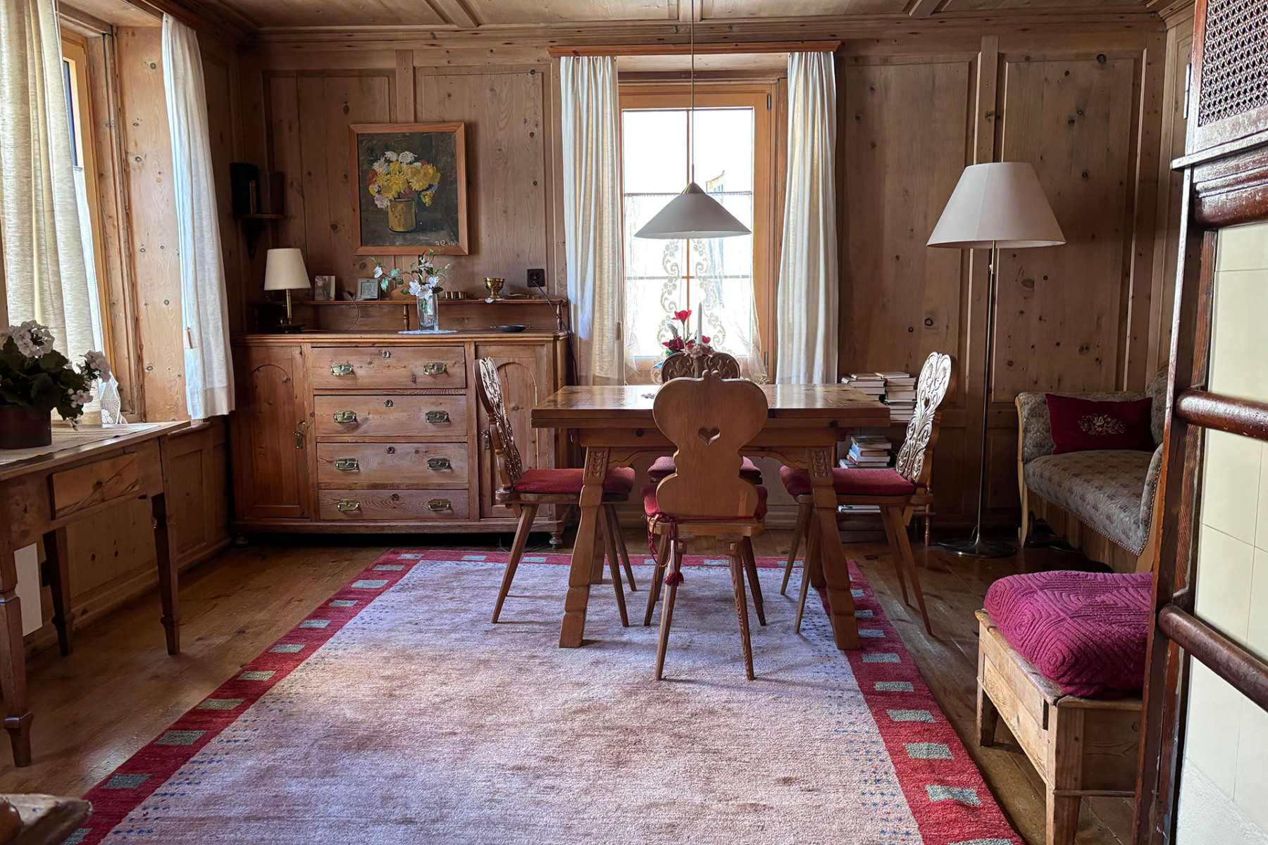 Durch den Keller gelangt man in den alten Stall und den Garten, über die Scheune geht's auf die grosse Terrasse, von der man einen wunderschönen Blick auf die Berge hat und dem Fluss Inn lauschen kann.