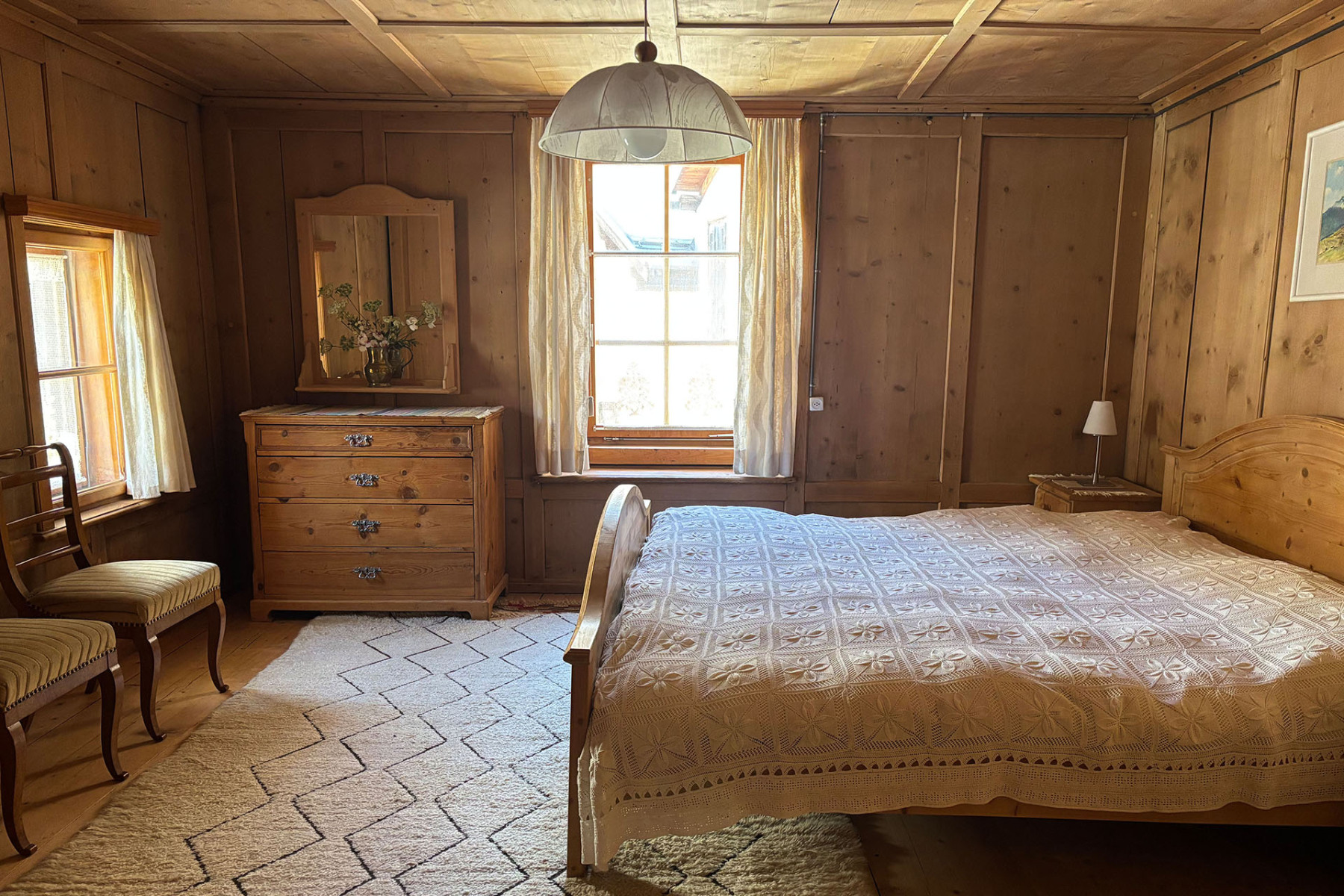 Durch den Keller gelangt man in den alten Stall und den Garten, über die Scheune geht's auf die grosse Terrasse, von der man einen wunderschönen Blick auf die Berge hat und dem Fluss Inn lauschen kann.