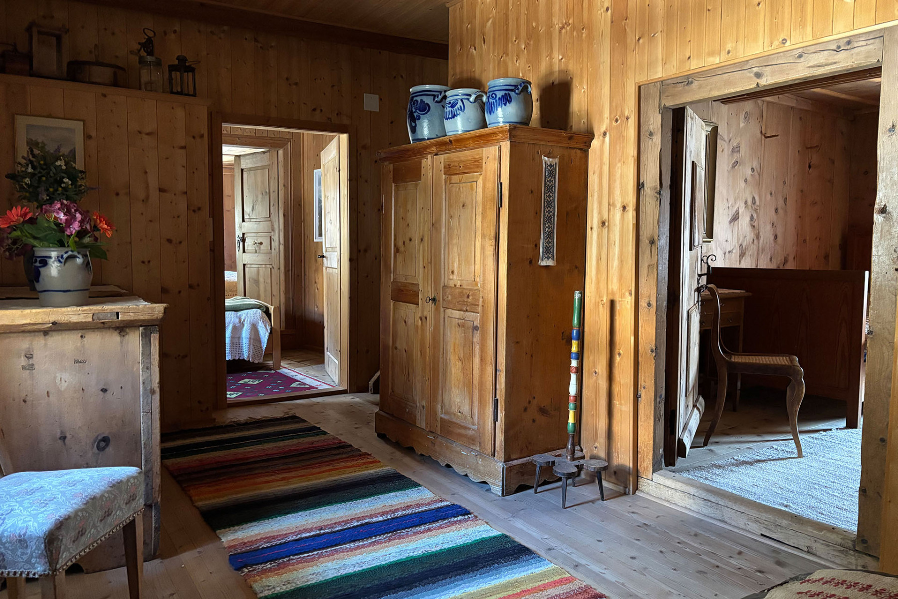 Durch den Keller gelangt man in den alten Stall und den Garten, über die Scheune geht's auf die grosse Terrasse, von der man einen wunderschönen Blick auf die Berge hat und dem Fluss Inn lauschen kann.