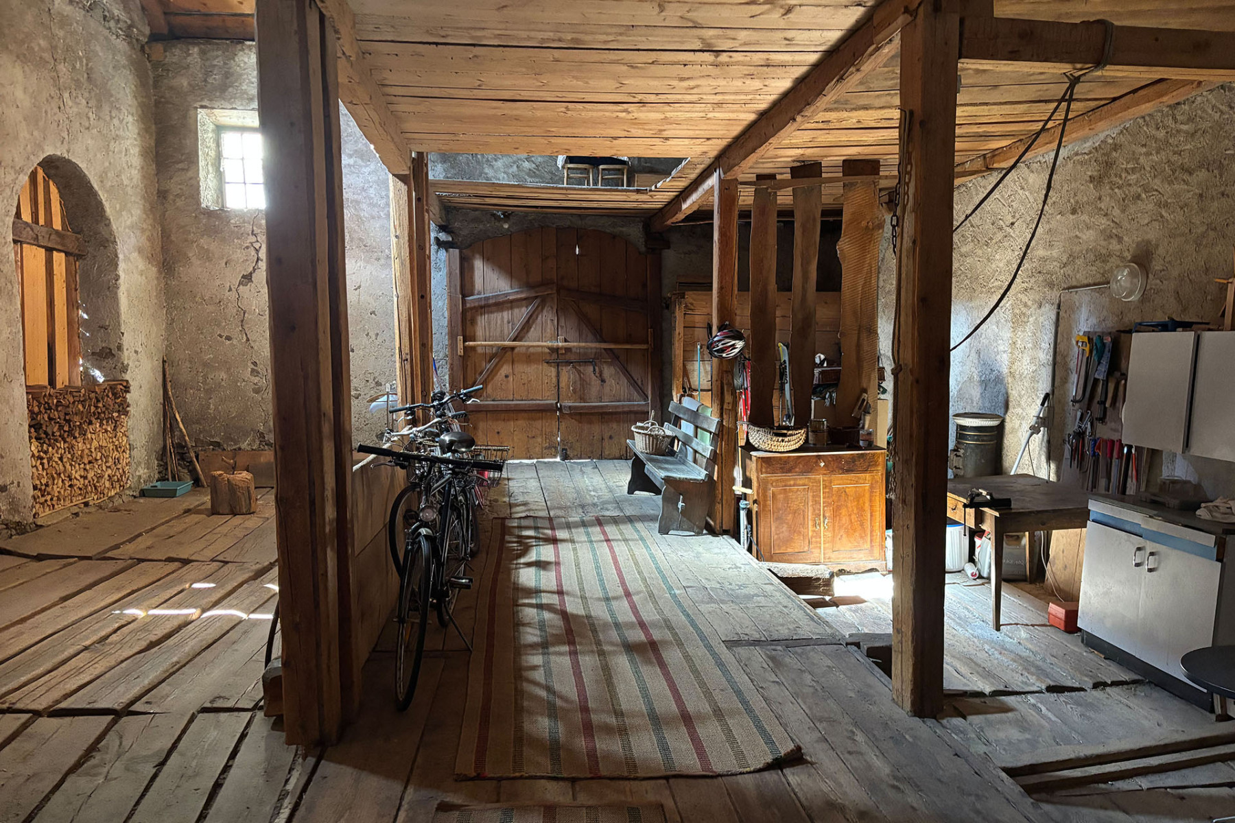 Durch den Keller gelangt man in den alten Stall und den Garten, über die Scheune geht's auf die grosse Terrasse, von der man einen wunderschönen Blick auf die Berge hat und dem Fluss Inn lauschen kann.